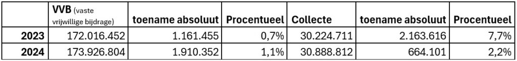In de Protestantse Kerk in Nederland stijgt de opbrengst uit de collecten met 2,2 procent ten opzichte van 2023 en dat betekent 664.101 euro meer met een totaalbedrag van 30.888.812 euro uit collecten in 2024. De bijdragen voor Actie Kerkbalans in de PKN stijgen ook licht met 1,1 procent ten opzichte van 2023. Dat betekent 1.910.352 meer aan kerkbalansbijdragen over 2024, met een totaalbedrag van 173.926.804 euro aan opbrengsten in dat jaar.