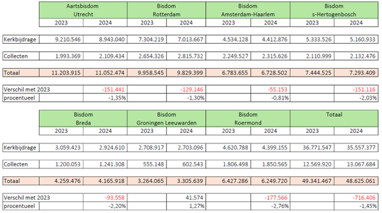 In de Rooms-Katholieke Kerk stijgt de opbrengst uit collecten van 12.569.920 naar 13.067.684 euro, een stijging met € 497.764,-. De opbrengsten uit Kerkbalansbijdragen dalen daarentegen met een bedrag van 12.141.70 euro in totaal. Dat levert over collecten en kerkbalansbijdragen bij elkaar opgeteld een daling op van 1,45 procent, een bedrag van € 716.406,- minder aan inkomsten voor de R.-K. Kerk. In 2023 lieten de bisdommen nog een kleine stijging zien over het totaalbedrag, namelijk van 0,16 procent, maar toen waren de verschillen tussen de bisdommen groter dan in 2024. De meeste bisdommen laten nu een daling zien van minder dan drie procent en alleen bisdom Groningen-Leeuwarden noteert een stijging van 1,27 procent.